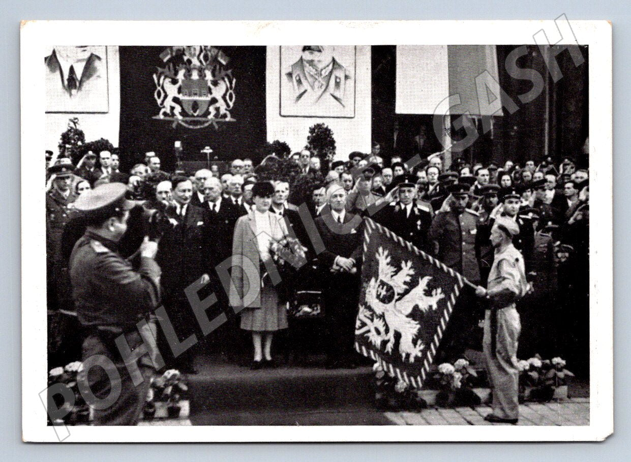 Historická pohlednice – prezident na tribuně před Staroměstskou radnicí, Praha