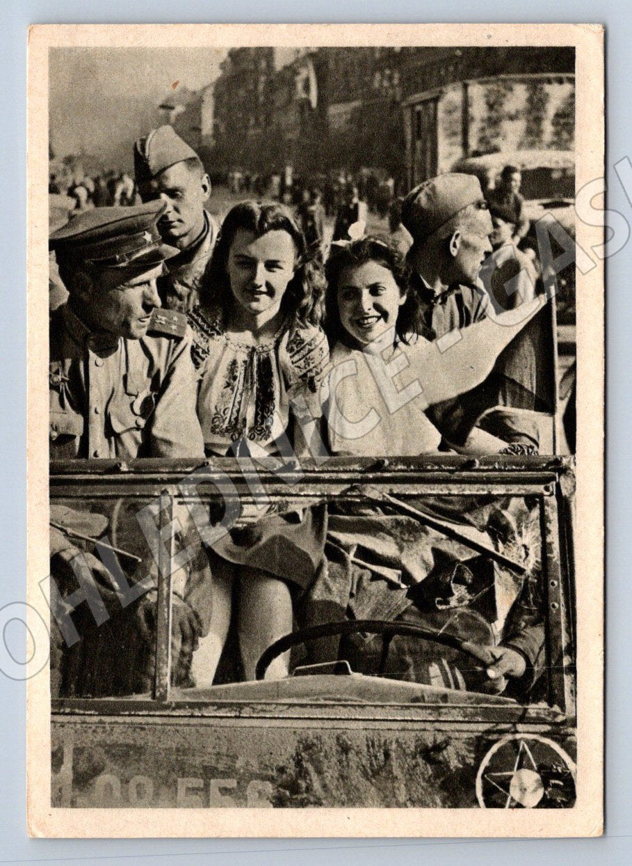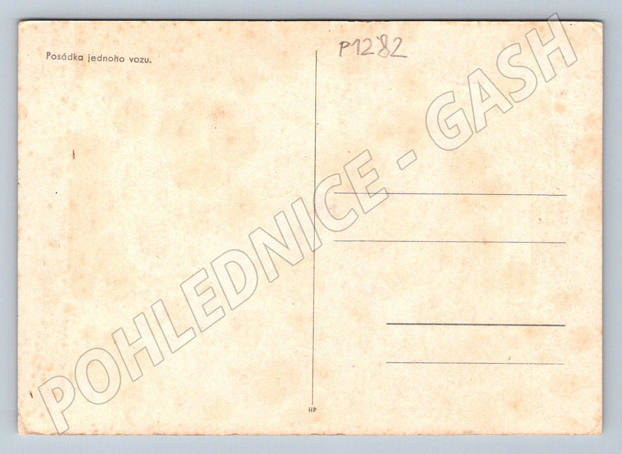 Originální černobílá pohlednice s názvem Posádka jednoho vozu zachycuje posádku automobilu, ve kterém sedí dívky ve folklórních krojích a muži ve vojenských čepicích. Pohlednice ilustruje atmosféru slavnostní události nebo průvodu, pravděpodobně z období první poloviny 20. století. Zadní strana pohlednice je nepopsaná a nese pouze tištěný popisek. Stará pohlednice vhodná pro sběratele historických fotografií se zaměřením na dopravu, lidové tradice nebo Českou republiku. Stav odpovídá stáří – mírně zažloutlá, okraje v pořádku.