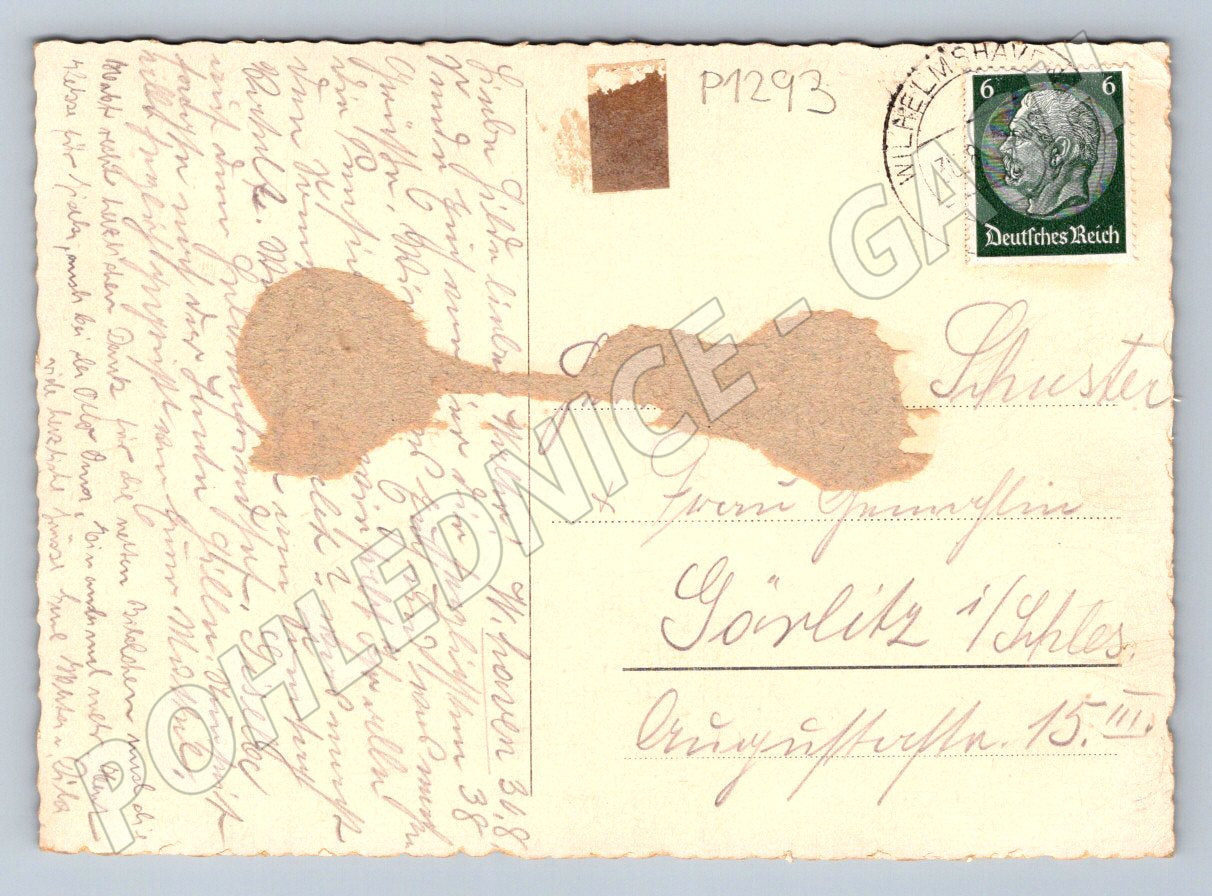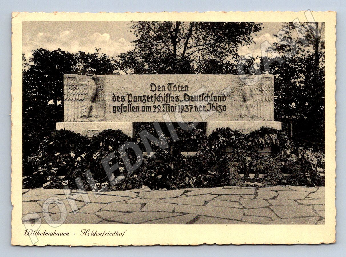 Originální historická pohlednice z Německa – Wilhelmshaven, Heldenfriedhof (vojenský hřbitov). Pohlednice zobrazuje památník padlých námořníků pancéřové lodi Deutschland, kteří zahynuli 29. května 1937 u ostrova Ibiza. Na zadní straně je čitelně viditelné ručně psané osobní věnování, německá známka a razítko Wilhelmshaven. Pohlednice má stopy stáří, náleží k zajímavým sběratelským kouskům předválečné korespondence z doby Německého císařství. Výborná pro sběratele historických pohlednic, vojenské historie i německých památek.