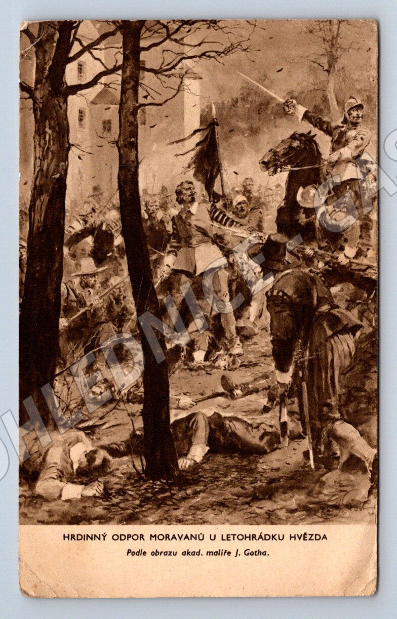 Historická pohlednice s motivem hrdinného odporu Moravanů u letohrádku Hvězda. Jedná se o reprodukci obrazu akademického malíře J. Gotha, pocházející z obrazových příloh knihy Dějiny Čech a Moravy nové doby. Pohlednice je v zachovalém stavu s drobnými známkami stáří na rozích. Vhodná pro milovníky historie, sběratele pohlednic či zájemce o historickou ikonografii českých dějin. Na zadní straně je krátký popis a prostor pro adresu.