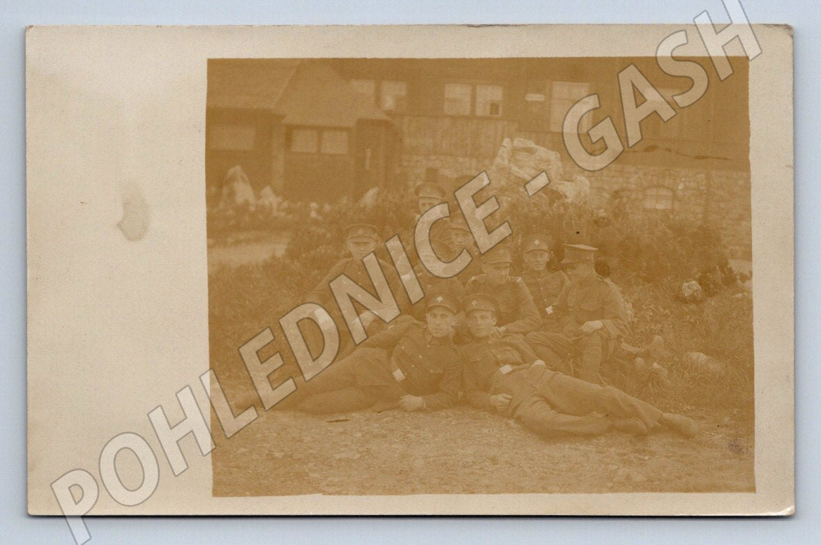 Starobylá pohlednice s fotografií skupiny vojáků, pořízená pravděpodobně v první polovině 20. století před budovou nebo kasárnou. Pohlednice je ve stylu malého formátu a zachycuje vojáky v uniformách při společném odpočinku venku na zahradě nebo před budovou na trávě. Na zadní straně je nepsaná, pouze s evidenčním číslem. Stav viz scan – místy stopy stáří, fleky a zažloutnutí, rohy mírně ošoupané. Skvělý sběratelský kousek pro milovníky historických fotografií a vojenské historie.