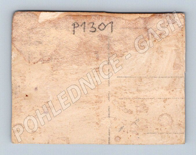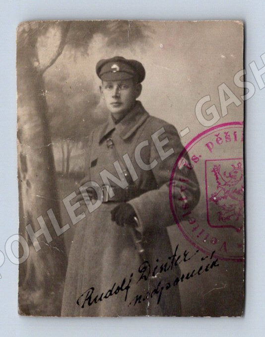 Originální stará pohlednice ruského vojáka z období první světové války, na přední straně dedikace: Rudolf Dinter, vojín... . Na pohlednici je jasně vidět uniforma vojáka a část stromoví v pozadí, včetně zajímavého razítka s motivem lva a nápisem v azbuce, pravděpodobně vojenská pošta nebo jednotka. Zadní strana je poškozena a nese jen částečné známky poštovního provozu, včetně starého inkoustového čísla P1301. Skvělý kus pro sběratele historických a tematických pohlednic s vojenskou tématikou z Ruska a SSSR.