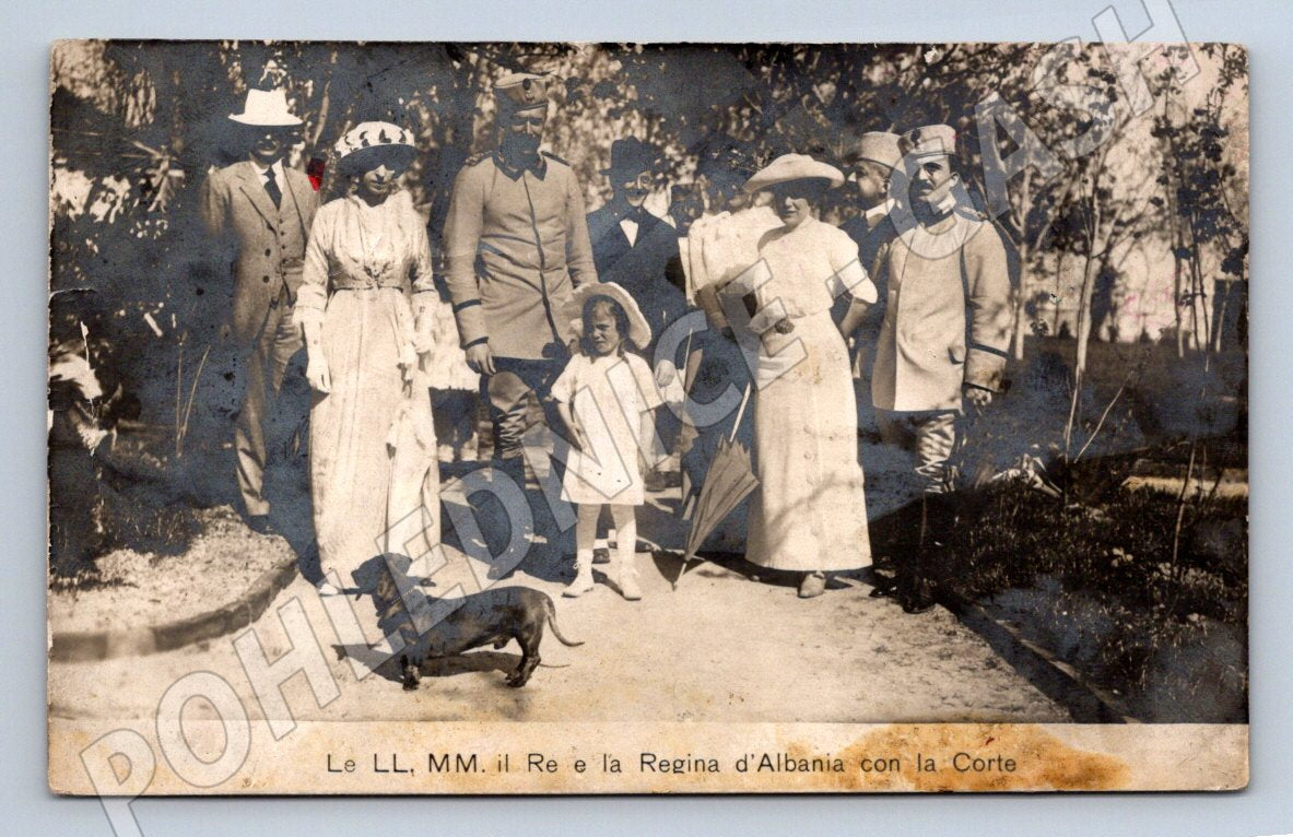 Originální černobílá pohlednice s vyobrazením krále a královny Albánie s doprovodem na procházce v zahradě. Jedná se o vzácnou a historicky cennou pohlednici – popis ve spodní části je ve španělštině/italštině: Le LL. MM. il Re e la Regina d Albania con la Corte . Pohlednice zachycuje několik osob v dobovém oděvu a v popředí malého psa. Vydavatel: Stab. Alterocca – Terni, fotograf: A. Scarpetti. Pohlednice je používaná, nese známky stáří, drobné skvrny a opotřebení, rub čistý bez textu. Ideální pro sběratele historických pohlednic a zájemce o evropskou monarchii a historii.