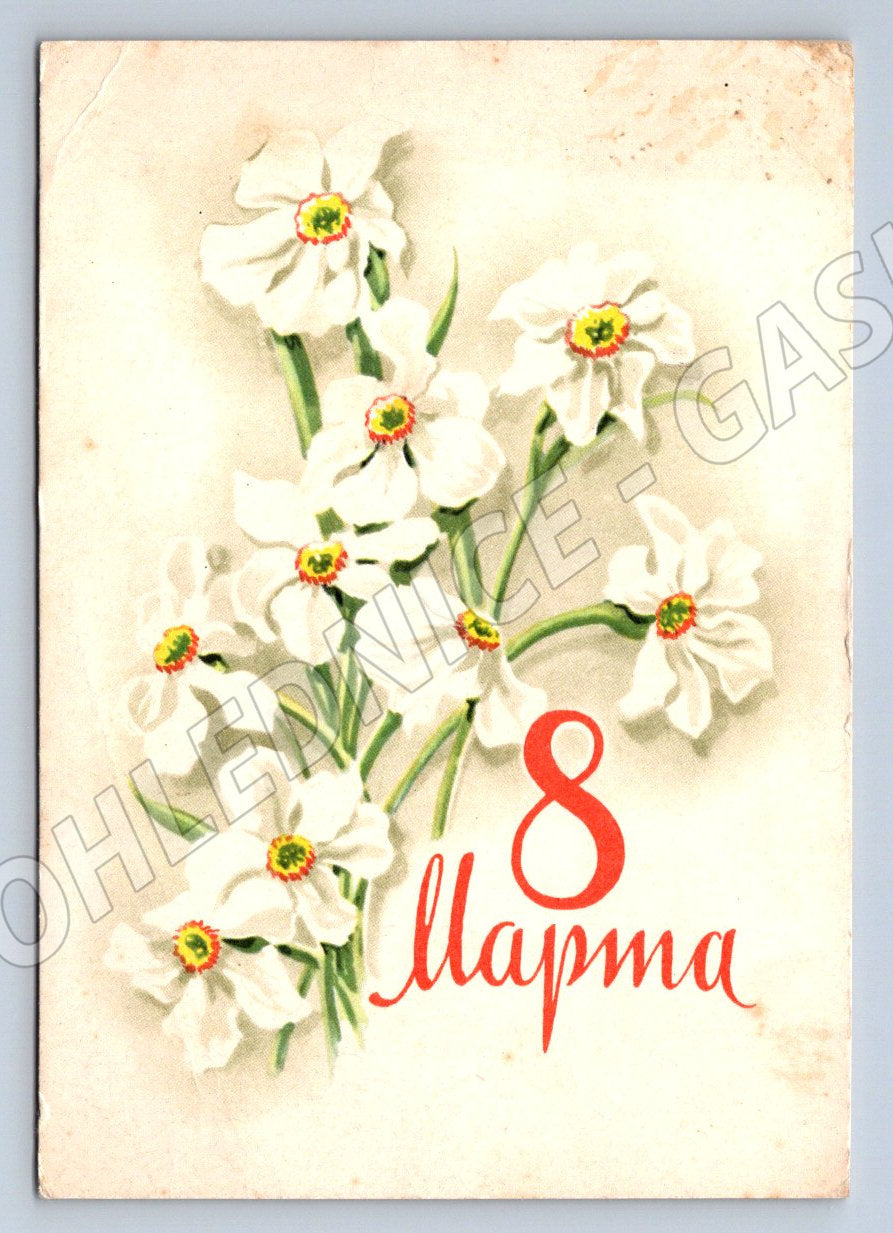 Originální pohlednice z období Sovětského svazu, vydaná k oslavě Mezinárodního dne žen – 8. března. Na přední straně jsou krásné květiny a typické ruské grafické zpracování s nápisem 8 Марта. Zadní strana obsahuje ručně psané blahopřání v ruštině. Vhodné pro sběratele, milovníky historie, či jako stylový dekorační předmět. Přibližný rok vydání: 1962. Mírné známky opotřebení odpovídající stáří. Rozměr klasické pohlednice.