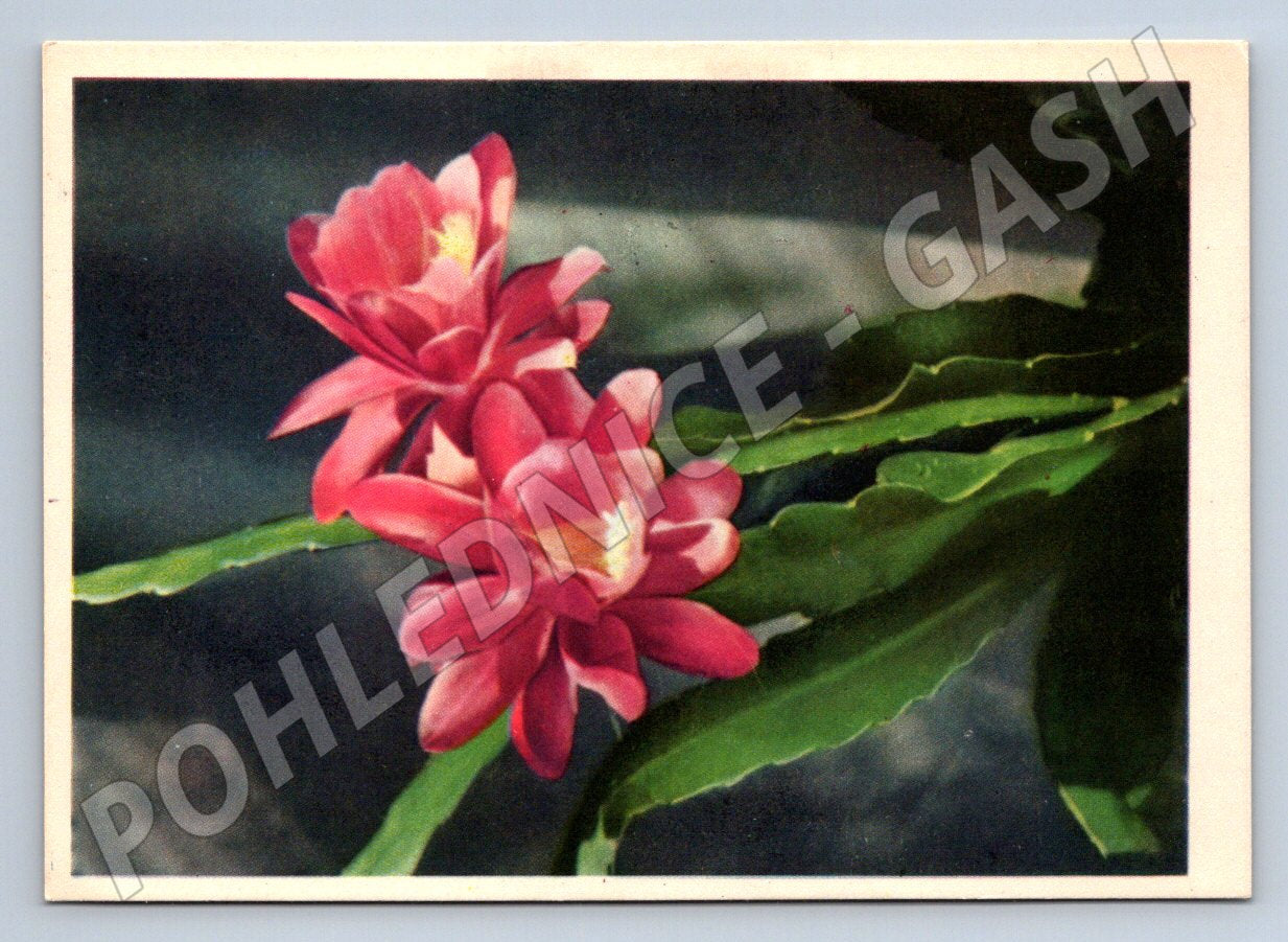 Nabízím originální sovětskou pohlednici z období SSSR s motivem kvetoucího fílkaktusu. Pohlednice je kolorovaná a na přední straně zobrazuje detailní snímek červených květů na zeleném listu. Na zadní straně je ručně psaný text v ruštině, pohlednice je neprošlá poštou. Rok vydání je 1959, vydal IZOGIZ, náklad 750 000 ks. Vhodná do sbírky nebo jako zajímavý doplněk do kolekce starých pohlednic. Stav viz foto – mírně opotřebované rohy dle stáří, jiné vady nepozoruji.