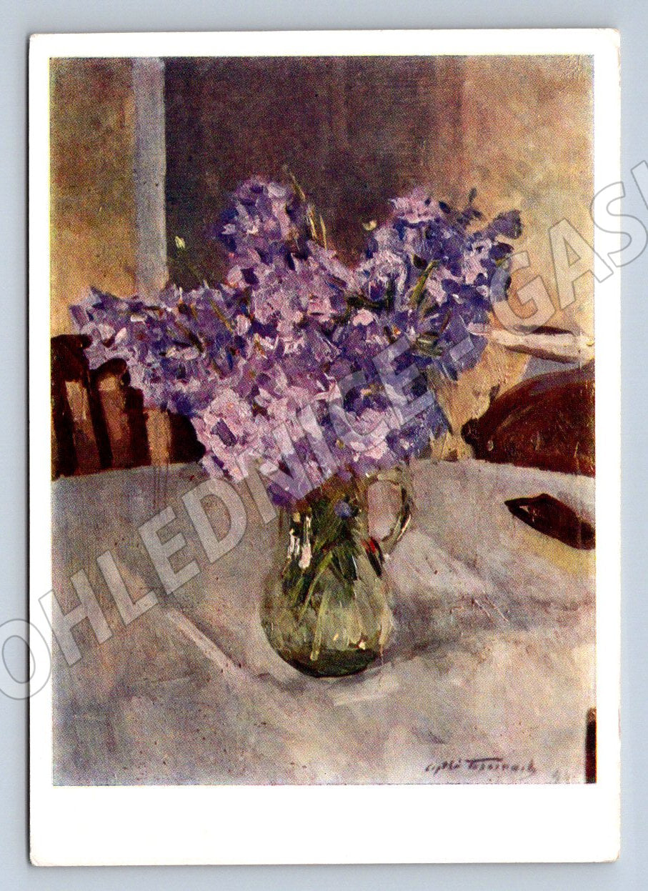 Pohlednice s uměleckým motivem namalovaným S. V. Gerasimovem s názvem Kolokolchiki (Zvonečky), 1944. Pohlednice byla vydána v Sovětském svazu v roce 1958 a na zadní straně je ručně psaný vzkaz z února 1958 adresovaný Alenushce. Motivem je malířsky zpracovaná váza s kyticí fialových zvonečků ve stylu klasické sovětské malby. Pohlednice je ve velmi dobrém stavu, vhodná pro sběratele sovětských nebo ruských pohlednic a milovníky uměleckých motivů.