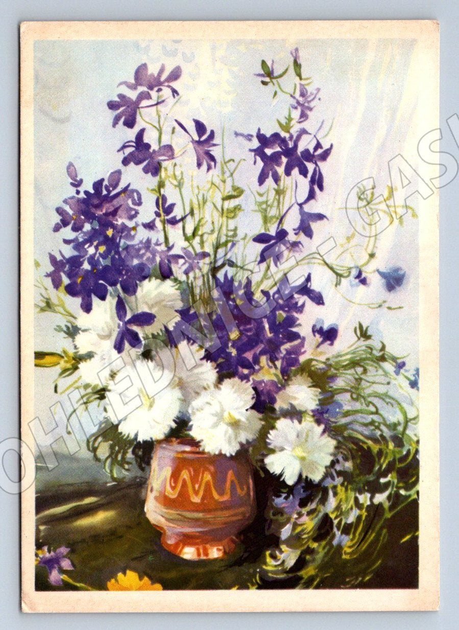 Originální stará pohlednice s malbou od ruského malíře E. Goljakovského, znázorňující krásné zátiší s fialovými a bílými květinami ve váze. Pohlednice byla vydána v SSSR, vydavatelství IZOGIZ, tisk provedl Polygrafkombinát Kalinin. Na zadní straně je ručně psaný vzkaz v ruštině. Stáří a původ činí tuto pohlednici vhodnou do sbírky pohlednic s malířskou tematikou i pro zájemce o sovětské umění. Rozměry klasického malého formátu. Pohlednice má drobné známky stáří, ale celkově je v pěkném stavu. Vhodné pro sběratele.