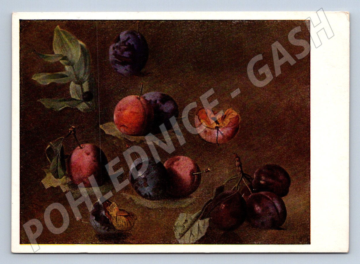 Pohlednice s reprodukcí obrazu J. Navrátila s motivem švestek (sliv), název originálu Slivy. Na přední straně je krásná malířská kompozice zralých švestek s větvičkou a listy na hnědém podkladu. Pohlednice je neprošlá a velmi dobře zachovalá, zadní strana s možností adresy a textu. Ideální sběratelský kousek pro milovníky malířství a výtvarného umění, zejména českých autorů. Vhodná také jako dekorativní předmět nebo dárek.