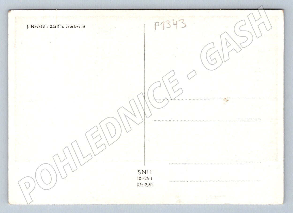 Nabízím originální pohlednici s motivem zátiší od J. Navrátila – Zátiší s broskvemi. Na lícové straně pohlednice je vyobrazen malířský motiv – broskve a další ovoce umístěné na stole. Pohlednice je kvalitní tisk a bude zajímavým přírůstkem do sbírky pohlednic s tematikou malířství či zátiší. Zadní strana pohlednice je nepopsaná, s označením SNU, a cenou 2,50 Kčs. Vhodná pro sběratele i milovníky klasického umění. Stav viz foto.