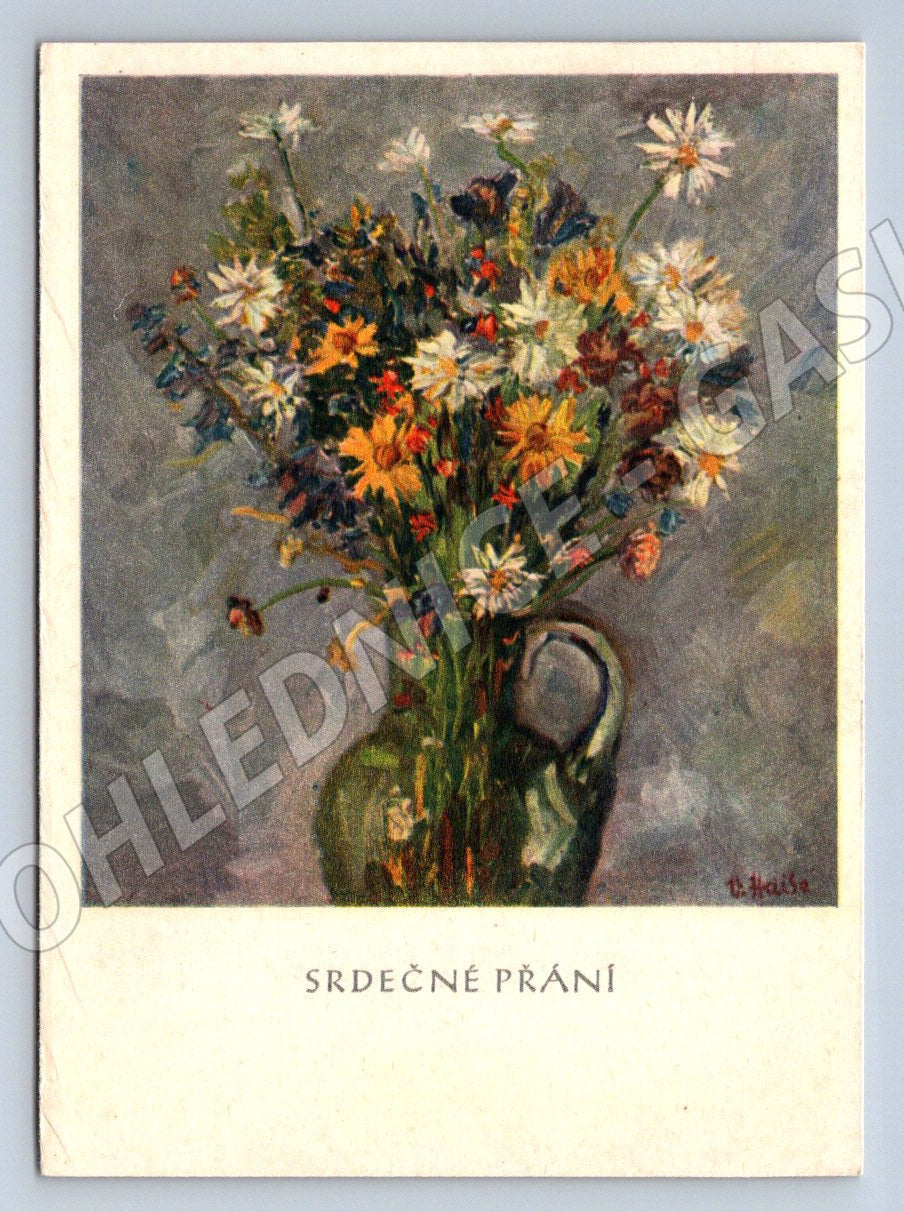Nabízím starou pohlednici s reprodukcí obrazu od V. Haise s názvem Polní kytice. Na přední straně je vyobrazen krásný malovaný motiv polních květin ve váze. Pohlednice má na pravém okraji nápis SRDEČNÉ PŘÁNÍ a na zadní straně je uveden autor a název díla. Jedná se o klasickou nepsanou pohlednici formátu cca 14 x 9 cm, určeno pro sběratele nebo jako stylová dekorace. Pohlednice odpovídá období cca 2. polovina 20. století, stav viz foto.