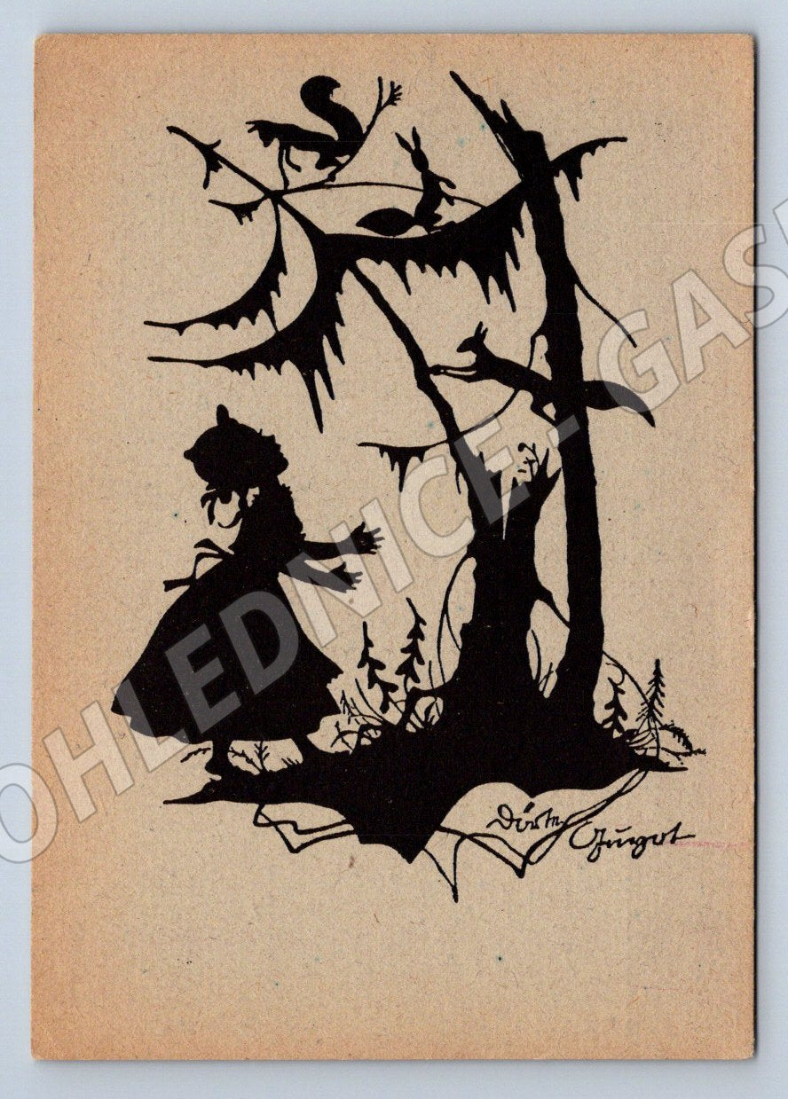 Originální stará pohlednice s výrazným černým siluetovým výjevem ve stylu grafiky nebo vystřihovánky, signováno Věn Grign. Jedná se o velmi stylizované umělecké ztvárnění postav a přírody – motiv připomíná scénu s lidovými či pohádkovými postavami v dramatickém aranžmá. Pohlednici vydal Wächter Verlag, Bad Teplitz-Schönau (Sudety), číslo ZL 5182. Rubová strana je nepopsaná, s místem pro známku i adresu. Vhodné pro sběratele starých uměleckých pohlednic nebo milovníky siluetového umění. Výborný stav vzhledem ke stáří, pouze drobné stopy času.