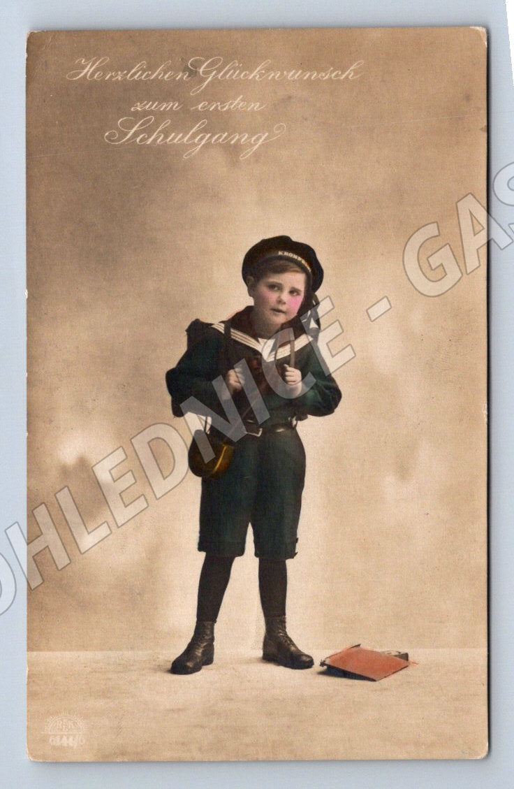Starší pohlednice z období před rokem 1950 s ručně kolorovaným motivem dítěte ve školní uniformě, držícího školní brašnu a kytici květin. Text v němčině Herzlichen Glückwunsch zum ersten Schulgang značí gratulaci k prvnímu dni školy. Zadní strana obsahuje ručně psané věnování a adresu, datováno 16. 4. 1928, bez známky. Pohlednice je v dobrém sběratelském stavu, s mírným opotřebením a drobnými skvrnami odpovídajícími stáří.