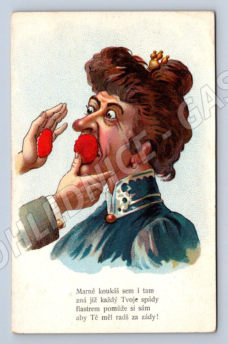Originální stará pohlednice s humornou ilustrací ženy přijímající bonbóny od muže. Barevná kresba je doplněna českým veršem na levé straně: Marně koukáš sem i tam, znají už každý Tvoje spády, flastrem pomůže si sám, aby Tě měl radši za zády! Pohlednice je neprošlá poštou, zadní strana je čistá. Výrazný barevný motiv, středoevropská produkce začátek 20. století. Pohlednice je ve velmi dobrém stavu s lehkou patinou odpovídající stáří. Sbírkový kousek vhodný pro milovníky starých ilustrací a humorných motivů.