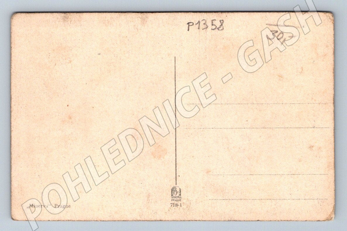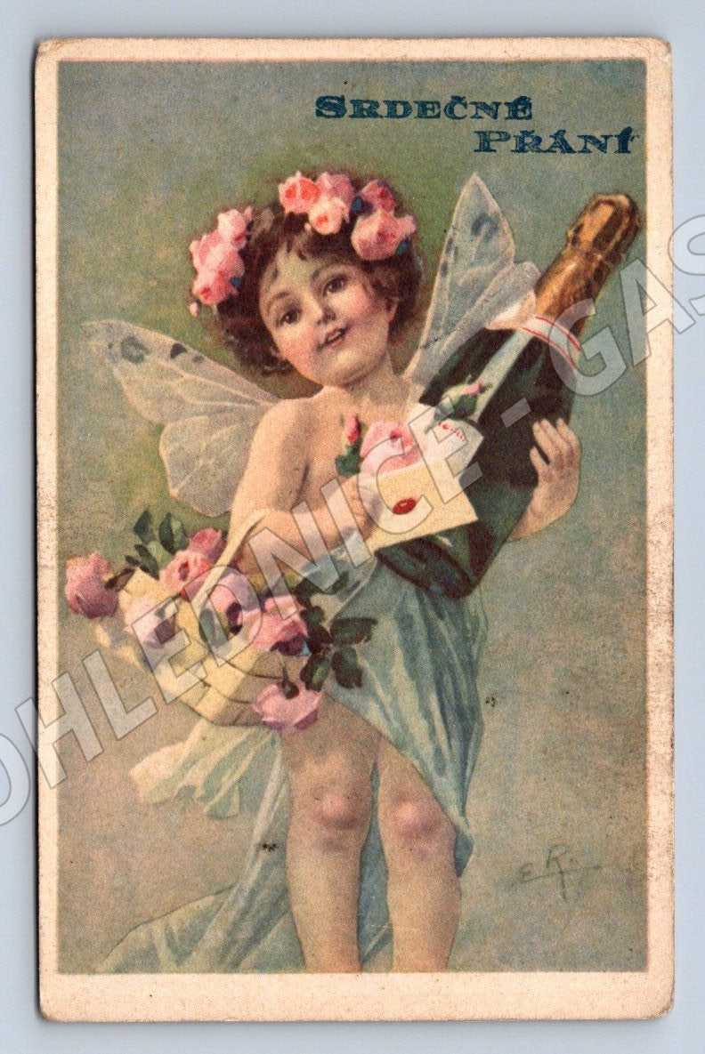 Originální stará pohlednice menšího formátu s malovaným motivem víly s křídly, květinami a lahví šampaňského. Text Srdečné přání a dekorativní květinová výzdoba připomíná klasická přání k oslavám. Pohlednice je na zadní straně opatřena nápisy Minerva Prague a číslem 781. Jedná se o působivý sběratelský kus z období první poloviny 20. století, vhodný pro sběratele historických českých pohlednic nebo jako jedinečný dárek. Stav odpovídá stáří, pohlednice vykazuje drobné známky opotřebení, otisky a patinu, které umocňují její dobový charakter.