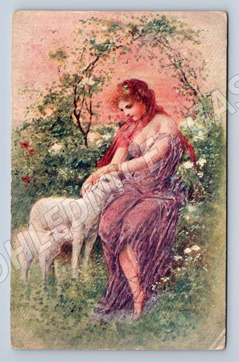 Historická pohlednice – žena s ovečkami, malba, České Mody