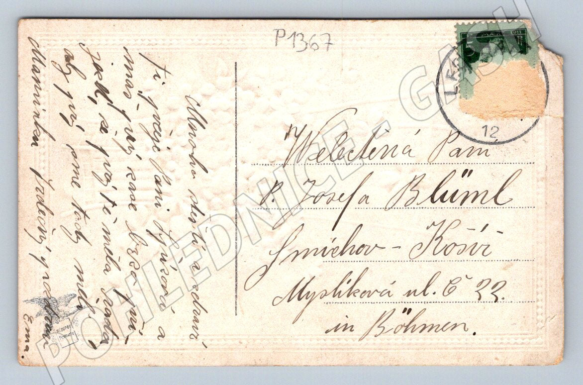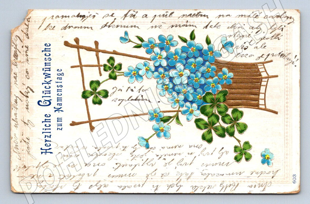 Starobylá pohlednice s motivem gratulace k svátku (Herzliche Glückwünsche zum Namenstage). Na přední straně je bohatě zdobený obrázek modrých květů pomněnek, čtyřlístků a dřevěný plot. Pohlednice je popsána rukou a má krásné dobové písmo i po okrajích. Na zadní straně je původní poštovní známka a razítko, adresováno do Čech (Smíchov-Kosíře, Mydlářova ul. č. 33) a datováno před rokem 1950. Pohlednice je ve sběratelsky ucházejícím stavu, lehce opotřebované rohy a místy drobné známky času, jinak barevně i písemně velmi dobře zachovalá. Skvělý kus pro milovníky historických pohlednic i sběratele korespondence z počátku 20. století.