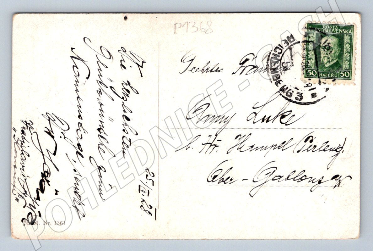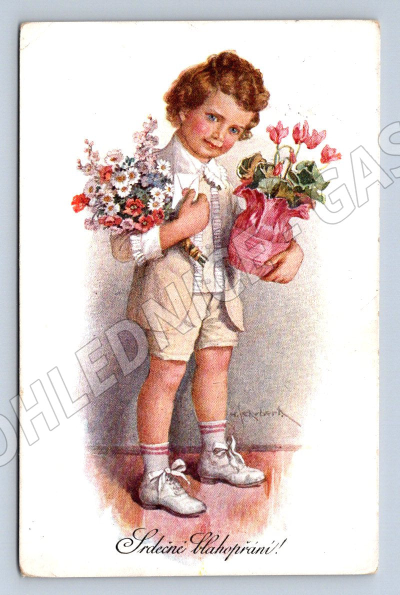 Krásná stará pohlednice malého formátu z období první poloviny 20. století. Na přední straně je půvabná kresba dítěte s květinami a květináčem a nápisem Srdečné blahopřání!, vhodná jako gratulace. Pohlednice je prošlá poštou, s čitelným razítkem a známkou Československa v hodnotě 50 haléřů. Na zadní straně naleznete ručně psaný text adresovaný osobě Amy Luke. Celkově sběratelsky zajímavý kousek vhodný do sbírky historických pohlednic.