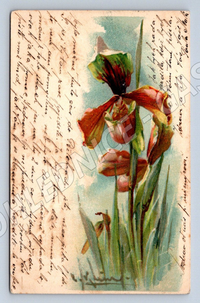 Starodávná pohlednice malého formátu z období před rokem 1950, zaslaná poštou. Na přední straně je krásná kresba květin – irisy, s výrazně barevnou malbou. Přes obraz je ručně psaný vzkaz. Na zadní straně najdete klasické rozvržení historické pohlednice s adresou, známkou (5 hellerů, rakousko-uherská známka) a čitelným razítkem. Rukopis na obou stranách je dobře zachován, čitelný a dodává pohlednici autentickou atmosféru doby. Ideální sběratelský kus pro milovníky starých pohlednic s námětem květin a historickou poštovní tématikou. Stav odpovídá stáří pohlednice, drobné známky používání, viz foto.