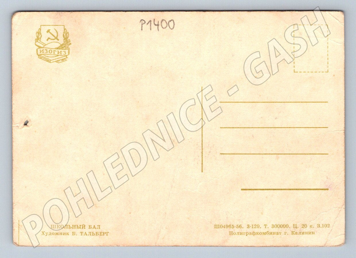 Originální sovětská pohlednice z období SSSR s názvem Školní bál (Школьный бал), autorem ilustrace je B. Talberg. Pohlednice zachycuje veselou scénu školního plesu, kde děti v uniformách a kostýmech tancují a baví se v slavnostně vyzdobené hale s barevnými stuhami. Na zadní straně nechybí typické znaky sovětské produkce – nápisy v azbuce, vydavatelství a emblém s kosou a kladivem. Pohlednice je vhodná pro sběratele tématu Rusko/SSSR nebo ilustrovaných pohlednic z období poloviny 20. století. Stav odpovídá stáří, obě strany jsou dobře dochované s drobnými známkami opotřebení, na přední straně drobné ohyby v rozích.