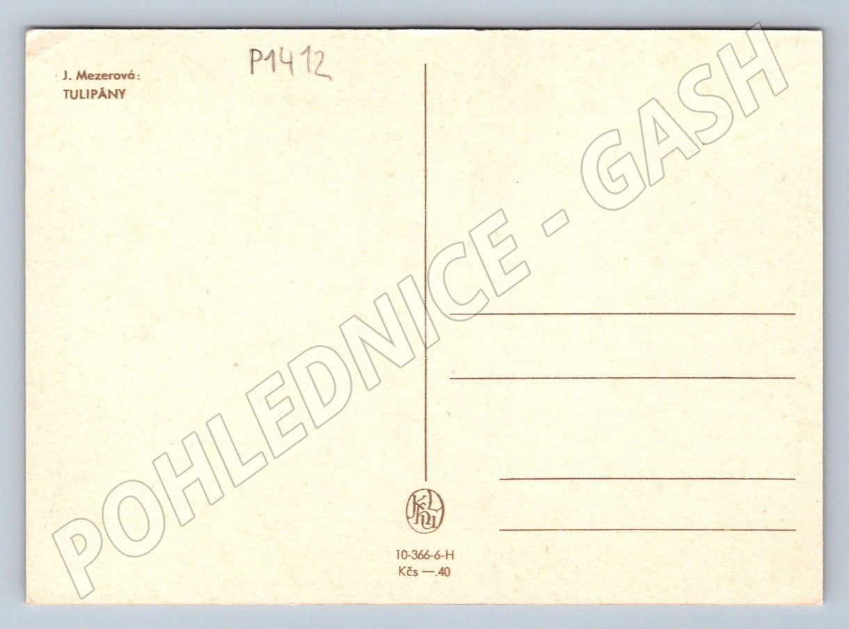 Originální pohlednice s květinovým motivem tulipánů od autorky J. Mezerové, s nápisem Srdečné přání . Na zadní straně označení TULIPÁNY , typický rozdělený prostor na adresu a vzkaz. Pohlednice je v dobrém stavu, bez osobního vzkazu. Vhodná pro sběratele historických pohlednic nebo jako stylové dekorativní přání.