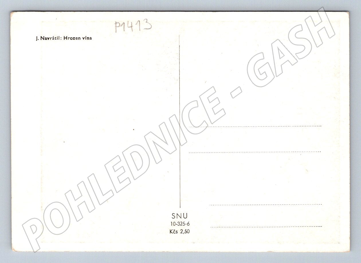 Pohlednice zobrazující malířské dílo od J. Navrátila s názvem Hrozen vína. Na přední straně pohlednice je realisticky ztvárněný hrozen tmavého vína, doplněný o vinné listy, vše na tmavém pozadí, které podtrhuje detaily ovoce i listů. Pohlednice není poštou prošlá, na zadní straně najdete pouze tiskovou informaci a název díla s autorem. Jedná se o pěkný sběratelský kousek vhodný zejména pro milovníky malířství, umění nebo pěstitelství. Stav odpovídá stáří, viz foto.