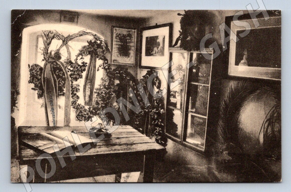 Tato stará pohlednice zobrazuje interiér světnice v Husově rodném domku v Husinci. Na černobílém snímku je vidět jednoduchý dřevěný stůl s otevřenou knihou a dekoracemi na pozadí, což vytváří autentickou atmosféru tradičního českého venkovského obydlí. Pohlednice je zachovalá, na zadní straně jsou viditelné ruční poznámky a razítko potvrzující historický kontext. Vynikající sběratelský kousek pro zájemce o etnografii a historii Čech.