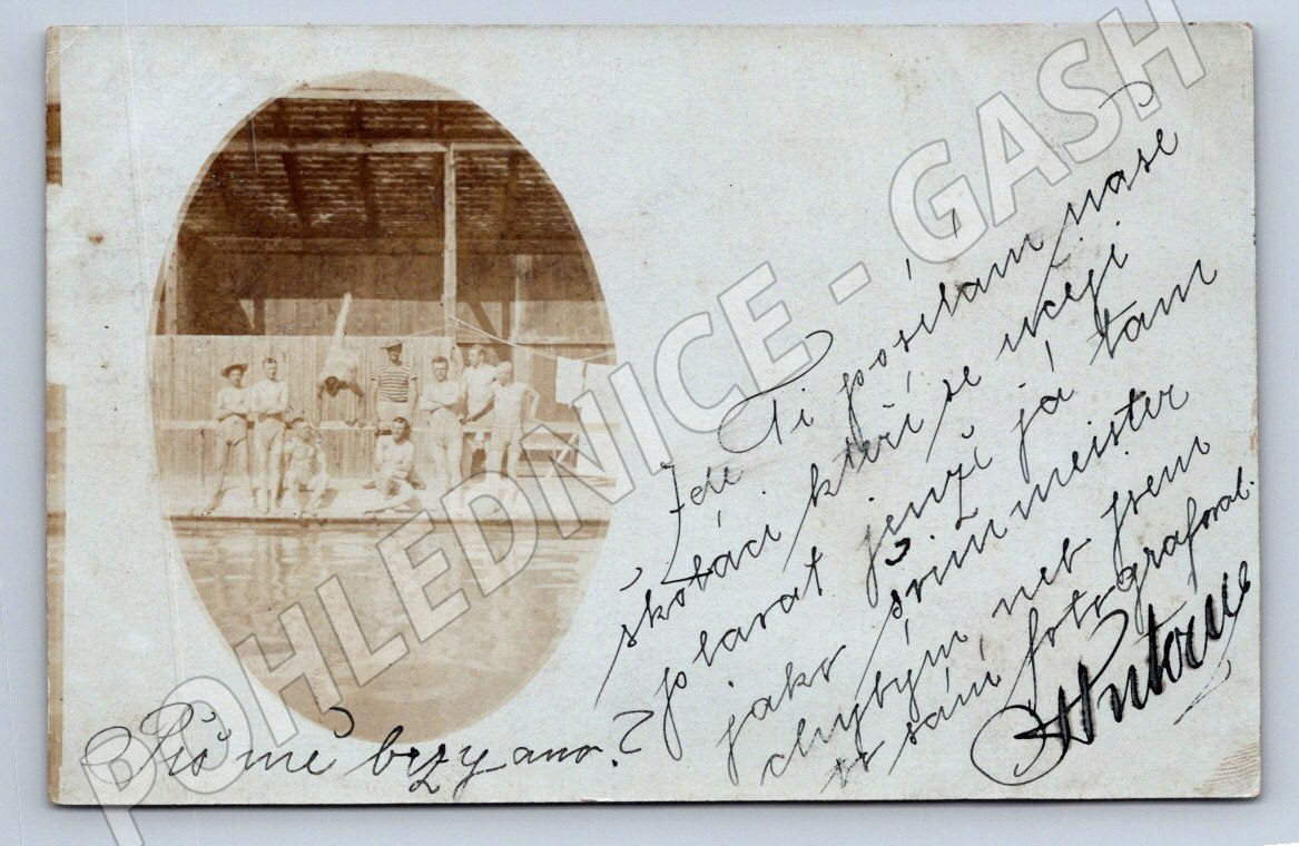 Starobylá pohlednice z roku 1908 s fotografií skupiny u vody PLOVÁRNA