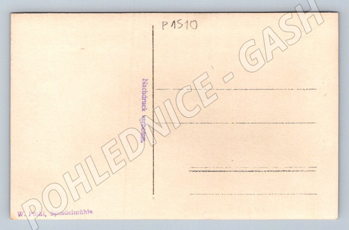 Starý pohled na přehradu Krausebanden, zobrazuje údolní hráz a okolní horskou krajinu. Pohlednice je v dobrém stavu, černobílá fotografie s typickým dobovým vzhledem. Ideální pro sběratele historických pohlednic a milovníky technických staveb a přírody. Na zadní straně je místo pro dopis a adresu, značení vydavatele W. Piohl, Spindelmühle. Text na pohlednici: Talsperre Krausebanden.