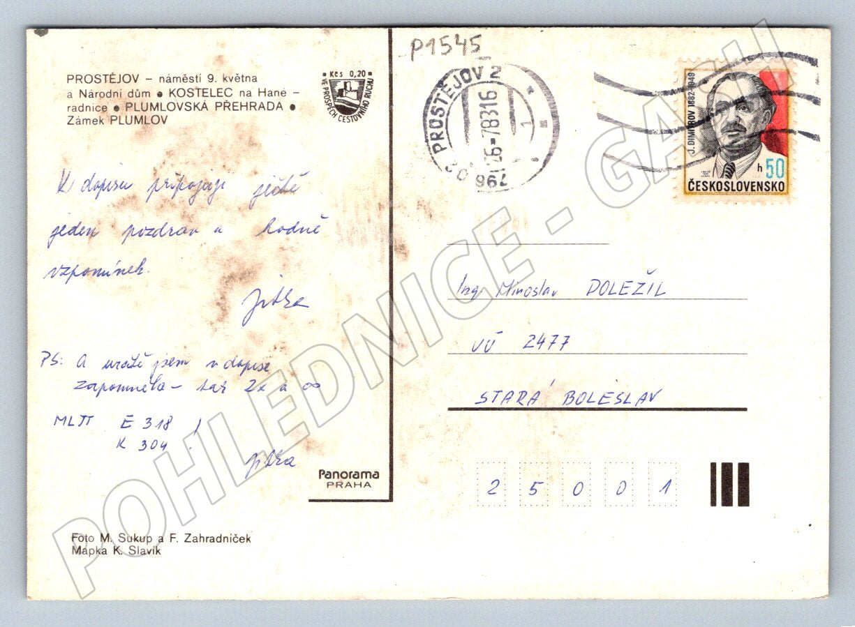 Tato pohlednice představuje Prostějov a okolí, včetně významných míst jako náměstí 9. května, Kostelec na Hané, Plumlovská přehrada a Zámek Plumlov. Na obrázku je také detailní mapa oblasti a několik vybraných fotografií z okolí Prostějova. Pohlednice je opatřena poštovní známkou Československo s portrétem, dofrankovaná a datována razítkem z roku 1966. Na zadní straně je rukopisná poznámka a adresa příjemce. Součástí je také natištěný text s informacemi o místech na fotografiích a jmény autorů fotografií a mapky. Pohlednice je dobře zachovalá, vhodná pro sběratele a milovníky regionálních motivů ČR.