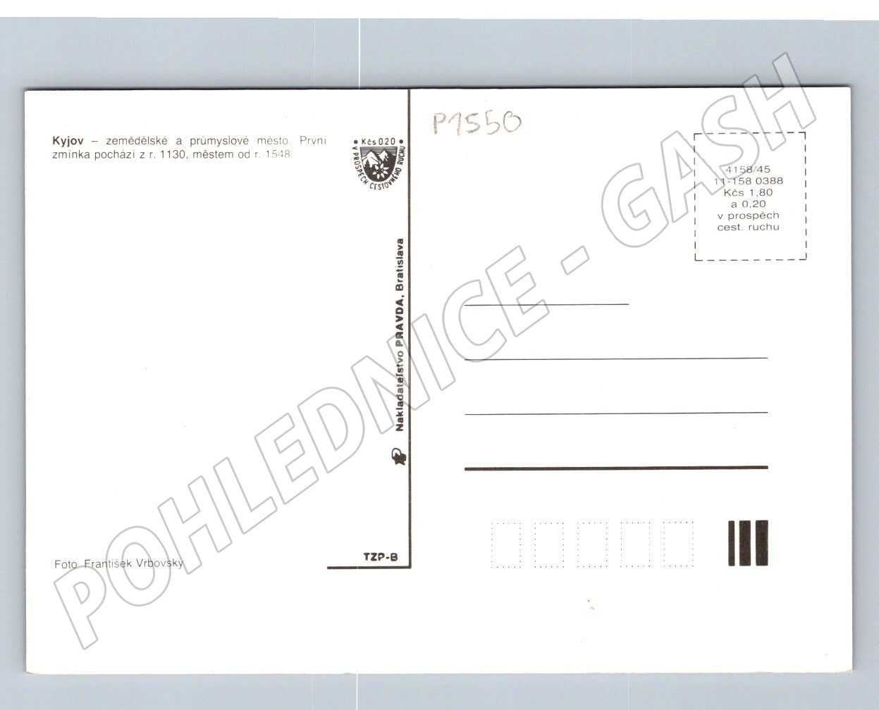 Pohlednice s koláží fotografií města Kyjov a jeho typických místních motivů včetně tradičních krojovaných postav. Kyjov je zemědělské a průmyslové město s první zmínkou z roku 1130 a statutem města od roku 1548. Pohlednice zachycuje historickou architekturu, městský periferní pohled i lidovou kulturu vyjádřenou kroji, což z ní činí zajímavý sběratelský kousek pro milovníky etnografie a regionální historie. Na zadní straně je tisková a cenová informace, včetně údaje o vydavateli Nakladatelství PRAVDA, Bratislava, a údaj o fotografovi Františku Vrbovském.