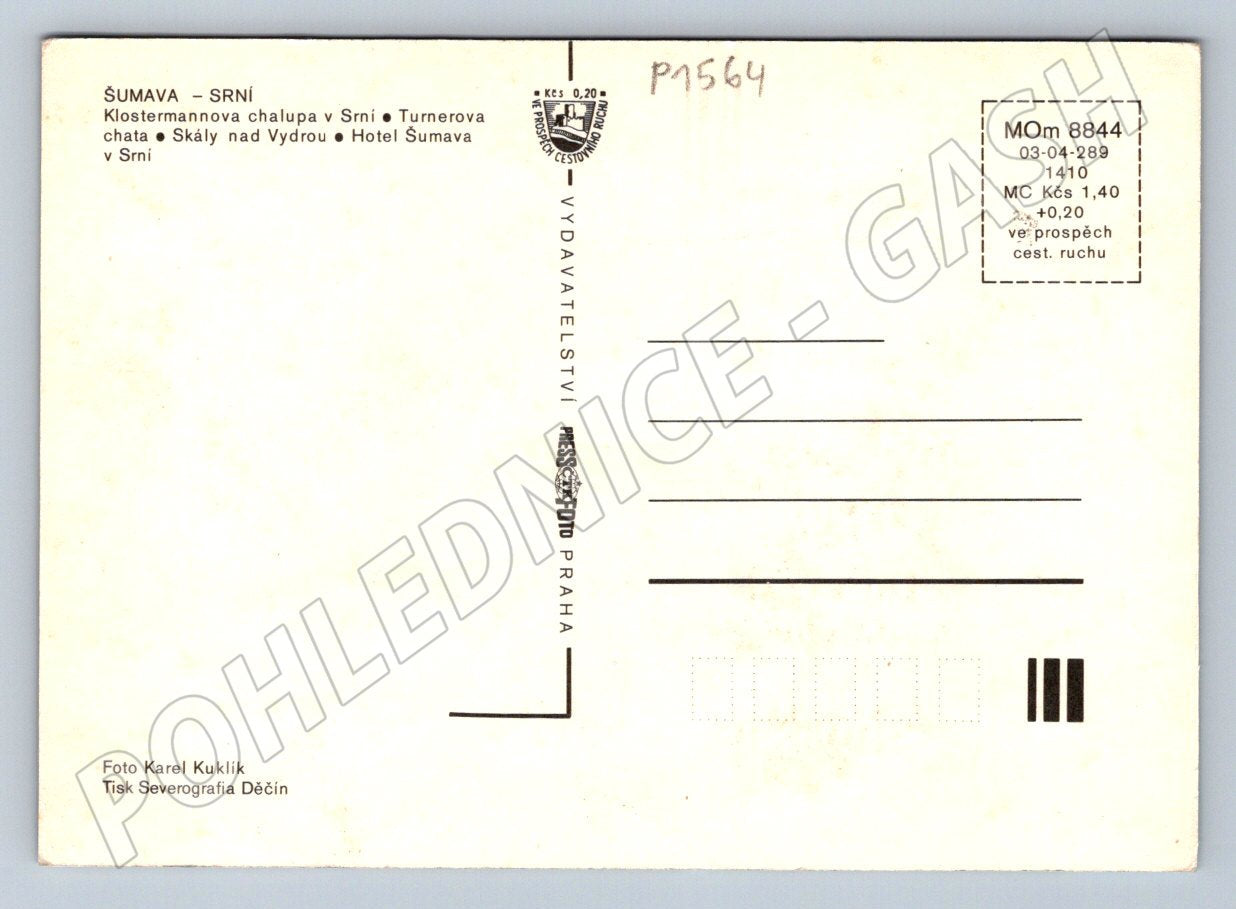 Nabízím sběratelskou pohlednici zobrazující malebné scenérie Šumavy a obce Srní. Pohlednice obsahuje fotografie Klostermannovy chalupy, Turnerovy chaty, skal nad řekou Vydrou a hotelu Šumava v Srní. Vyznačuje se dobovou grafikou a kvalitním tiskem, foto Karel Kuklík, tisk Severografia Děčín. Pohlednice je v hezkém stavu, vhodná pro sběratele a milovníky českých hor a přírody.