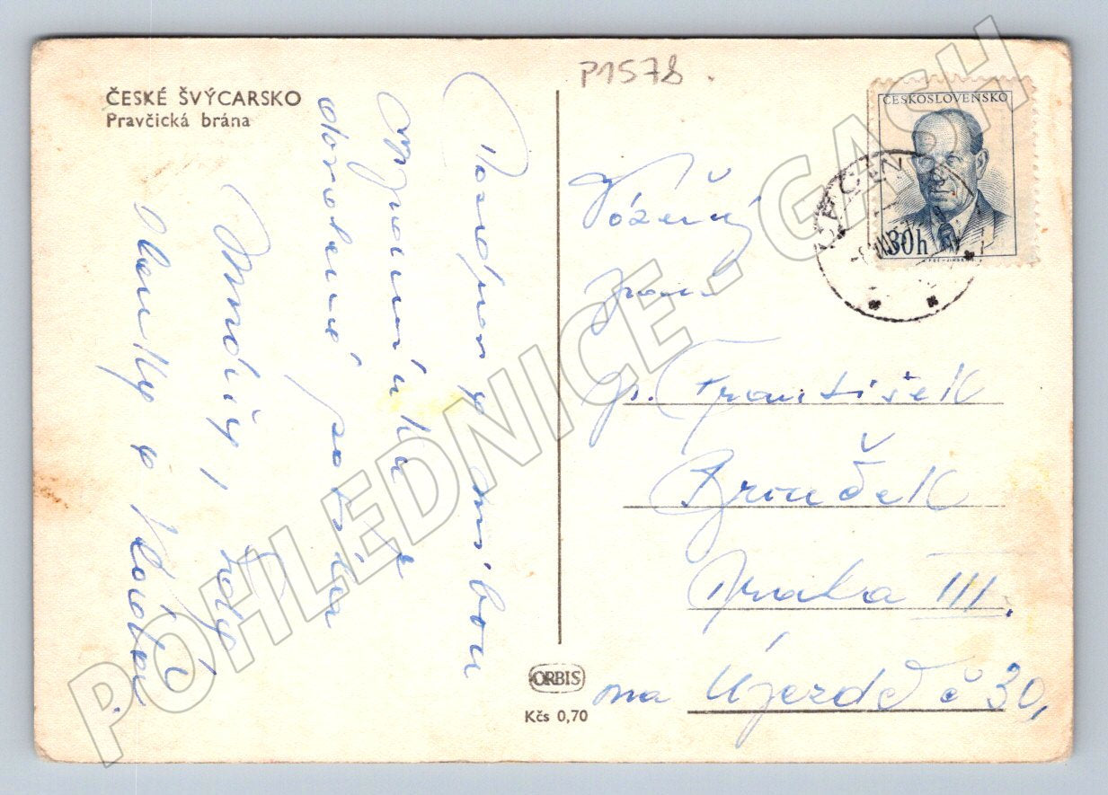 Tato stará pohlednice zobrazující Pravčickou bránu, největší pískovcovou skalní bránu v České republice, pochází z období Československa, což dokládá i známka a razítko na zadní straně. Pohlednice je černobílá a nabízí detailní pohled na tuto významnou přírodní památku v Českém Švýcarsku. Na zadní straně jsou ručně psané věnování a adresa, což dodává pohlednici historickou autenticitu. Perfektní doplněk do sbírek tematických pohlednic zachycujících významné přírodní a kulturní památky ČR. Stav odpovídá stáří, lehce opotřebovaná, ale bez větších poškození.