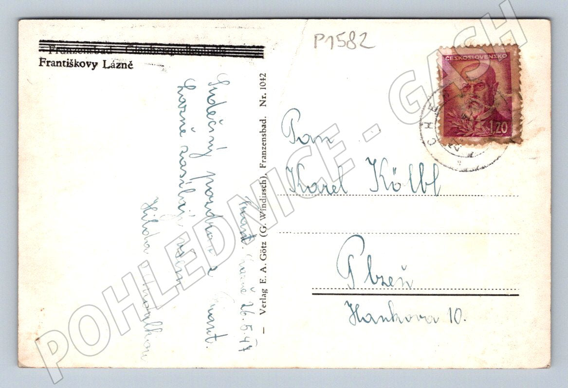 Nabízím starou pohlednici z Františkových Lázní, která zobrazuje historickou budovu známou svým unikátním architektonickým stylem. Pohlednice je černobílá, pravděpodobně ze 40. let 20. století, s razítkem a známkou Československa. Na zadní straně je zachována psaná zpráva a adresní informace, což ještě více podtrhuje její autentický historický charakter. Ideální k doplnění sbírky nebo jako zajímavý dárek pro milovníky historie a architektury.