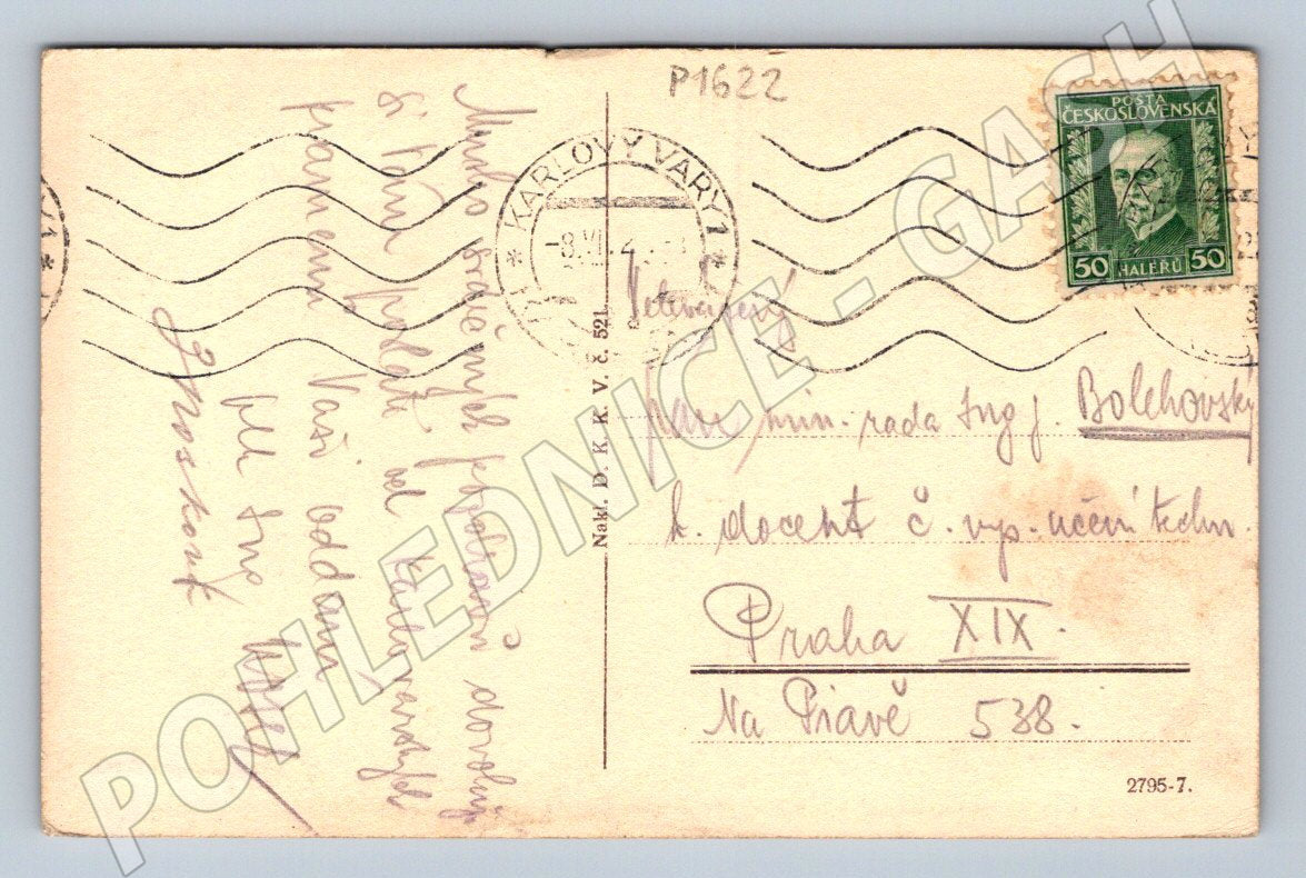 Originální černobílá pohlednice z první poloviny 20. století zobrazující slavný Hotel Imperial v Karlových Varech. Pohlednice byla skutečně odeslaná poštou, má známku a jasně čitelné poštovní razítko z období Československa. Na zadní straně je ručně psaný vzkaz. Výborný historický dokument i sběratelský kousek z éry známých lázní a architektonických památek. Rozměr klasického malého formátu, drobné známky stáří (patina, jemné opotřebení rožků). Vhodné pro sběratele pohlednic s tématikou lázní, architektury či Karlových Varů.