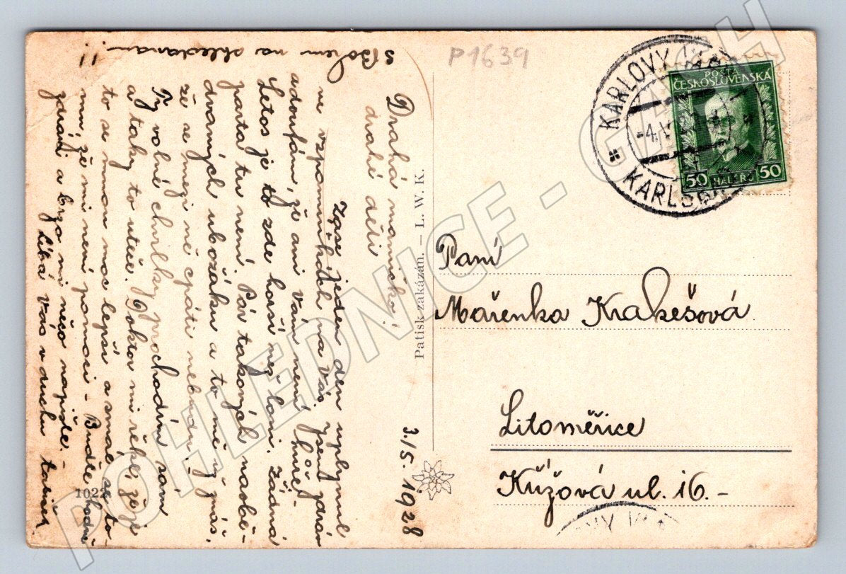 Originální historická pohlednice z období první poloviny 20. století s motivem Karlových Varů. Na pohlednici je zachycen známý most přes řeku Ohři s působivým pohledem na část města s dobovou zástavbou. Pohlednice je použita, na zadní straně nechybí známka a ručně psaný text adresovaný do Litoměřic. Stav odpovídá stáří – drobné zašpinění a lehká patina, rohy lehce otřelé. Vhodné pro sběratele historických pohlednic i milovníky Karlových Varů.