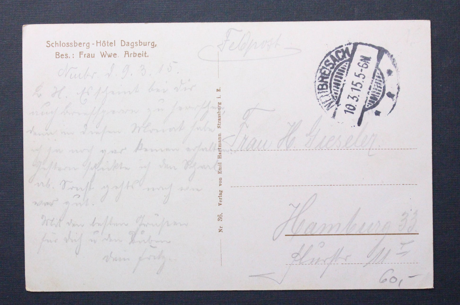 Vojenká pohlednice Feldpost polní pošta Schlossberg Dagsburg 1915