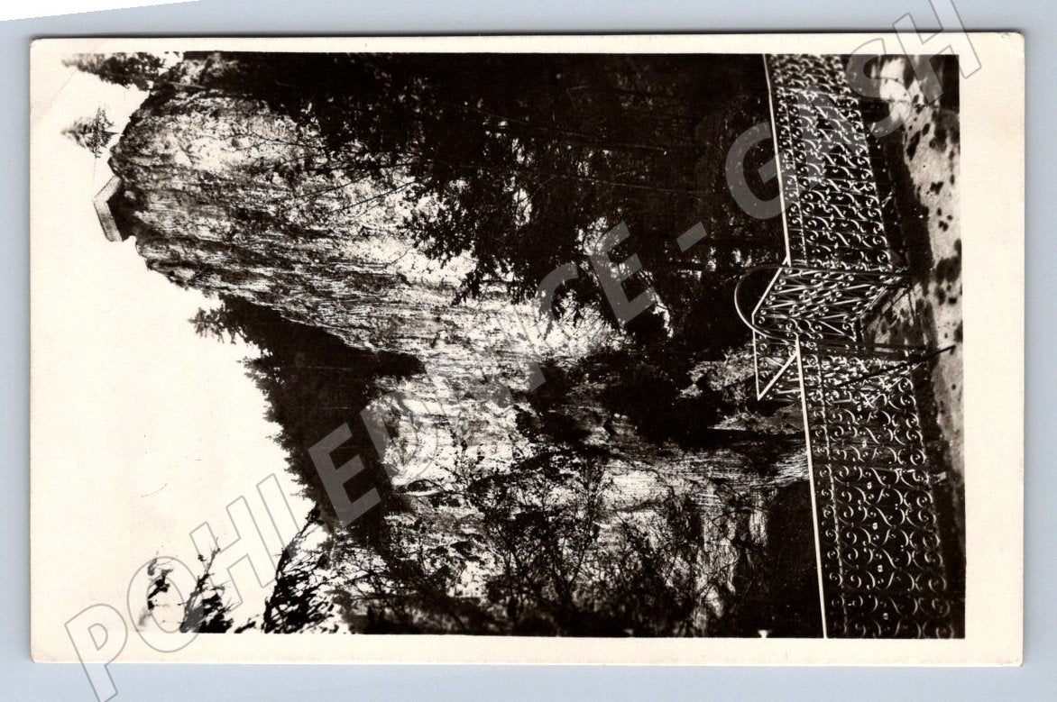 Černobílá pohlednice zachycující vyhlídku na známou přírodní památku Propast Macocha v Moravském krasu. Na přední straně je vidět detailní pohled na skalní stěny a zábradlí vyhlídkového altánu, odkud je výhled do propasti. Pohlednice je neprošlá poštou, vzadu je pouze tištěný popis místa a razítko Macocha. Vhodné pro sběratele pohlednic s motivy přírodních zajímavostí a českých památek. Vydáno Národní správou Moravského Krasu v Brně.
