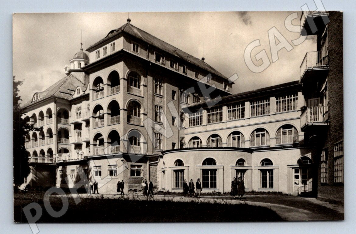 Originální stará černobílá pohlednice zobrazující budovu Priessnitzových léčebných ústavů v Lázních Jeseník. Pohlednice je na přední straně ilustrována detailním fotografickým záběrem ikonického lázeňského domu s charakteristickými arkádami a kopulí. Zadní strana obsahuje standardní předtištěné rozdělení pro adresu a známku, tisková značka ORBIS a cena 0,50 Kčs. Velmi pěkný sběratelský kousek vhodný pro milovníky historických lázní a architektury. Pohlednice je čistá, nepopsaná.