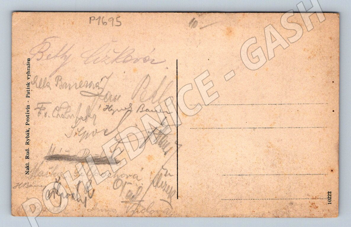 Originální stará pohlednice s názvem Protivín – Celkový pohled, která zobrazuje panoramatický pohled na město Protivín z první poloviny 20. století. Pohlednice je v malém formátu a dle známek stáří spadá do období před rokem 1950. Na zadní straně je řada vlastnoručních podpisů, což z ní činí zajímavý sběratelský kousek. Barevný tisk zachycuje náměstí, měšťanské domy, kostel a v dálce tovární komíny. Vydavatel: Nakl. Rud. Ryšák, Protivín – Patisk Vyhrazen. Pohlednice vykazuje běžné známky stáří – mírné zašpinění a opotřebení, bez známky poštovního použití. Skvělý tip do sbírky historických pohlednic Čech.