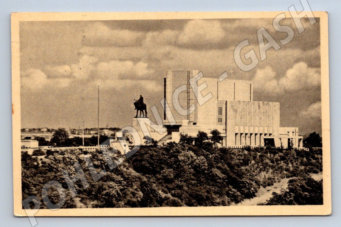 Originální stará pohlednice zobrazující Památník osvobození v Praze na Vítkově s jezdeckou sochou Jana Žižky. Pohlednice je černobílá, klasického malého formátu a byla odeslána z Prahy, což dokládá poštovní razítko i známka s prezidentem Edvardem Benešem o hodnotě 30h. Adresovaná do Plzně, se zachovaným rukopisným vzkazem. Stav pohlednice odpovídá stáří, vhodná pro sběratele historických pohlednic a milovníky české historie či Prahy. Přibližné stáří pohlednice je 40. léta 20. století.