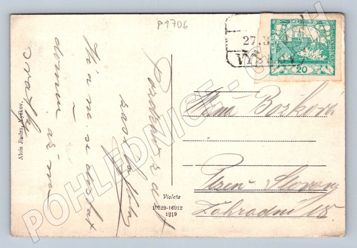 Starobylá pohlednice z města Vyškov, která zobrazuje historické panorama města s výraznými věžemi kostela a radnice. Jedná se o pohlednici malého formátu, která byla odeslána v období první republiky. Na zadní straně je dobová známka s poštovním razítkem a adresou adresáta. Pohlednice nese rukopisné věnování a známky běžného opotřebení odpovídající stáří. Jedinečný sběratelský kus vhodný do sbírky nebo jako dárek pro milovníky historie českých měst.