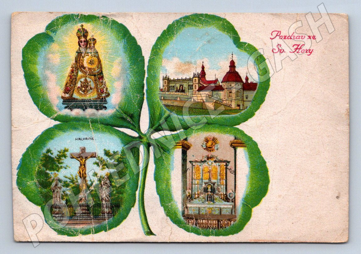 Starší barevná pohlednice s motivem Svaté Hory u Příbrami. Na přední straně pohlednice jsou čtyři ilustrace v rámci čtyřlístku - vyobrazení sošky Panny Marie Svatohorské, pohled na komplex Svaté Hory, výjev Kalvárie a oltářní výzdoba. Ve vrchní části je nápis „Pozdrav ze Sv. Hory“. Pohlednice je v dobrém stavu vzhledem ke stáří, nese známky opotřebení a drobné skvrny a ohyby, zadní strana bez popisu. Vhodné pro sběratele historických pohlednic z období před rokem 1950, sběratele sakrálních památek nebo milovníky české historie.