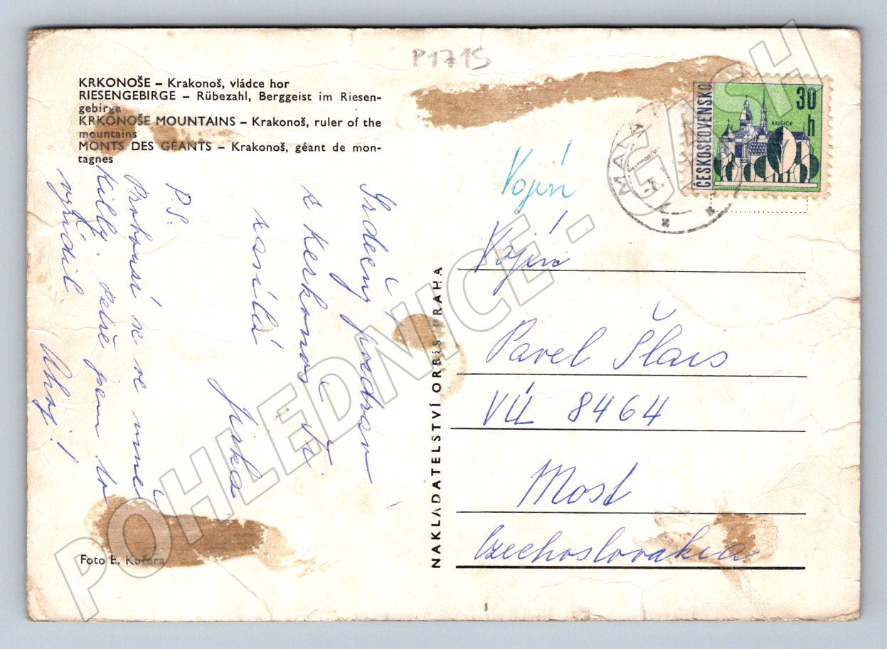 Originální pohlednice s motivem legendárního Krakonoše – vládce hor Krkonoš. Na přední straně je barevná fotografie postavy Krakonoše s typickým vousem a holí v přírodě. Zadní strana obsahuje ručně psaný vzkaz a adresu. Pohlednice byla odeslána z Československa, jak dokládá dobová známka i otisk razítka. Jedná se o zajímavý sběratelský kousek z Krkonoš vhodný nejen pro sběratele pohlednic, ale i pro milovníky českých hor a folkloru. Pohlednice nese drobné známky stáří a opotřebení, odpovídající času a způsobu odeslání.