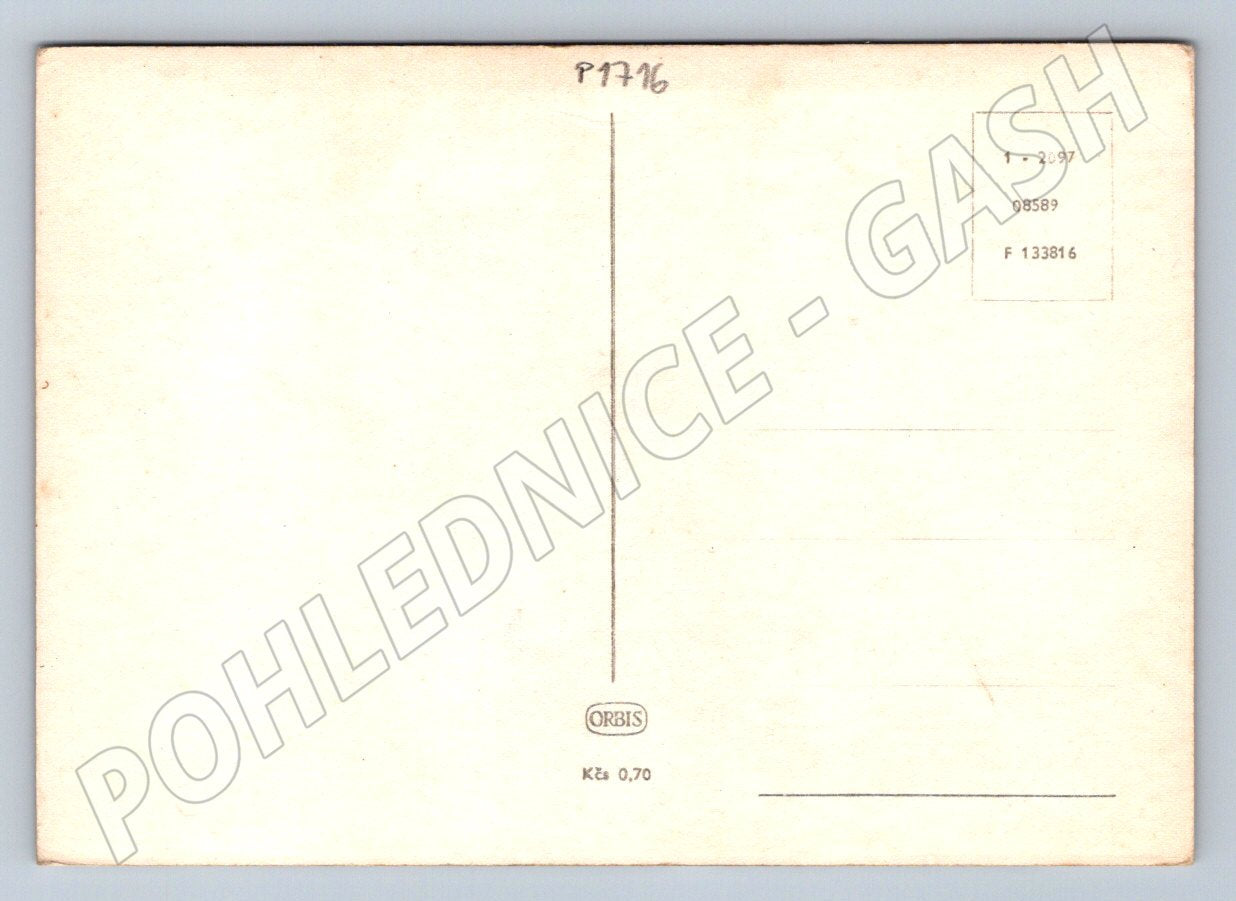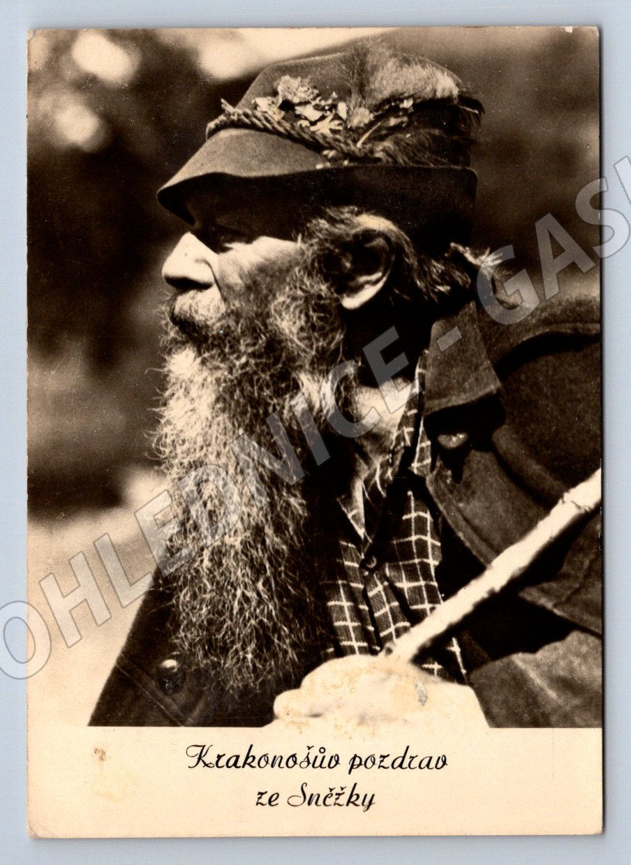 Originální černobílá pohlednice s motivem Krakonoše, postava s dlouhým plnovousem, kloboukem a dýmkou, s textem Krakonošův pozdrav ze Sněžky . Pohlednice zobrazující známou pohádkovou postavu ochránce Krkonoš. Na zadní straně klasické rozdělení na adresu a text, vydavatel ORBIS, cena 0,70 Kčs. Výborný sběratelský stav, drobné známky stáří a opotřebení. Pozoruhodný kousek pro sběratele starých pohlednic či milovníky regionální historie. Formát odpovídá době vydání, předpoklad do roku 1950.