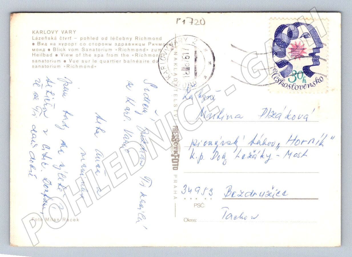 Originální pohlednice z Karlových Varů, zobrazující slavnou sochu jelena v lázeňské čtvrti – pohled od lázeňského sanatoria Richmond. Na pozadí je vidět přírodní scenérie s historickými budovami typickými pro tuto slavnou lázeňskou oblast. Pohlednice byla odeslána, nese známku a poštovní razítko. Autorem fotografie je Milan Racek. Jedná se o sběratelsky zajímavý kus s autentickou dobovou atmosférou, vhodný pro milovníky pohlednic z Karlových Varů a lázeňských měst. Stav dle fotografií – mírné opotřebení odpovídající stáří.