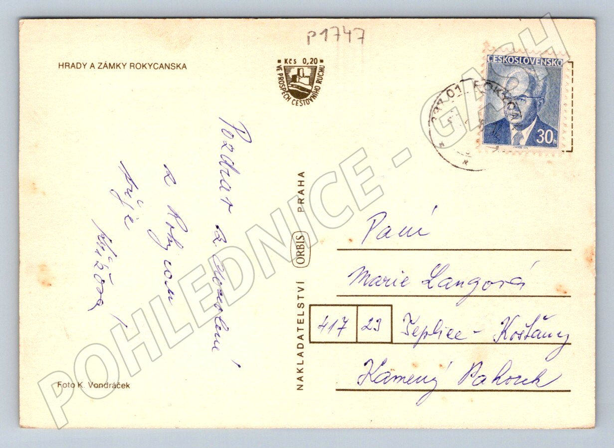 Barevná pohlednice z období Československa s motivy hradů a zámků Rokycanska. Na přední straně najdete koláž fotografií těchto památek: Zbiroh, Březina, Kamýk, Libštejn a Zvíkovec. Na žlutém pozadí je mapa s vyznačením polohy hradů a zámků v okolí Rokycan. Zadní strana pohlednice je orazítkována, se známkou a ručně psaným pozdravem. Vydal Orbis, fotografie K. Vondráček. Výborný sběratelský kus pro milovníky historie nebo pohlednic s tématem českých hradů a zámků.