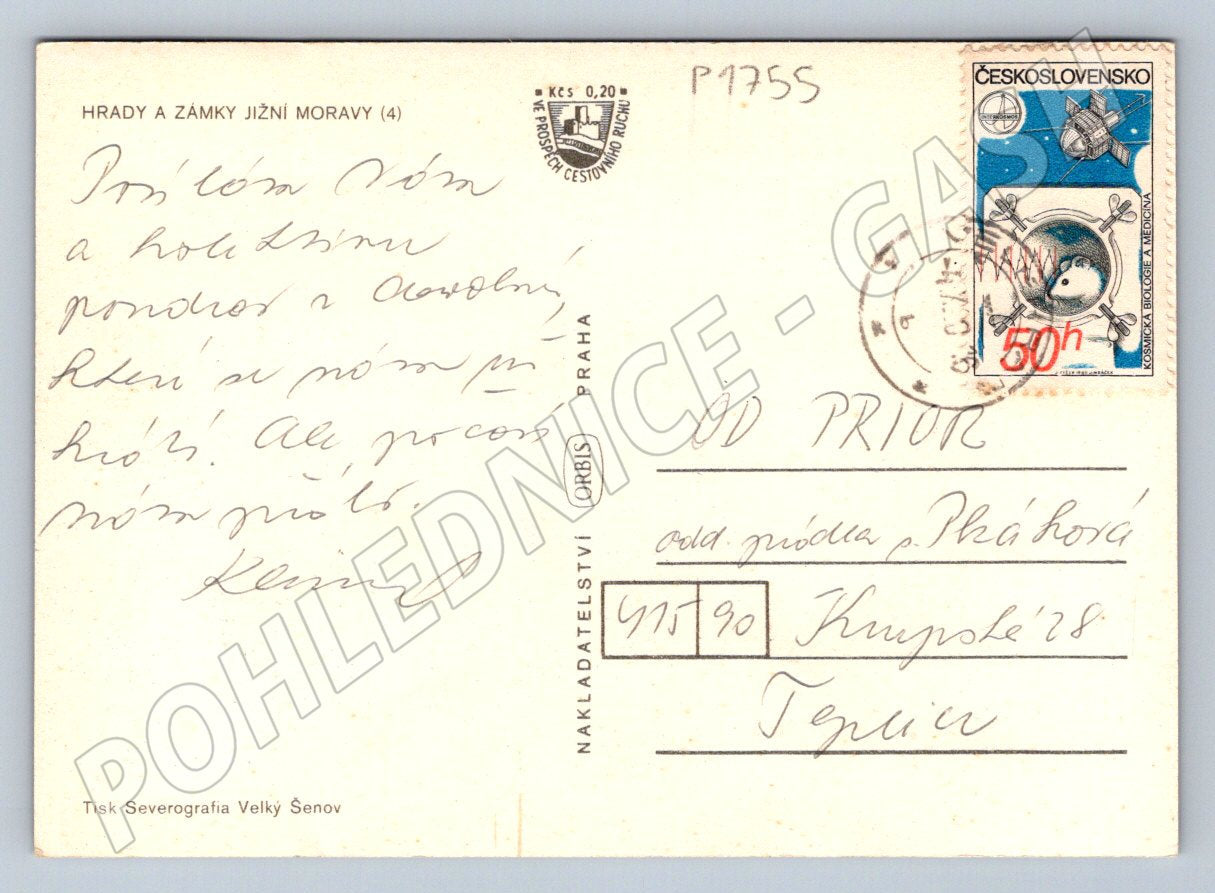 Pohlednice s motivem hradů a zámků jižní Moravy. Na přední straně jsou barevné fotografie a erby významných míst: Roštejn, Náměšť nad Oslavou, Rájec nad Svitavou, Židlochovice a Vizovice, včetně jejich erbů. Pohlednice byla vydaná nakladatelstvím Orbis, Praha, tisk Severografia Velký Šenov. Na zadní straně je rukou psaný text, známka z období Československa a razítko s datem. Ideální sběratelský kousek pro milovníky historických památek jižní Moravy a filokartu. Stav viz foto.