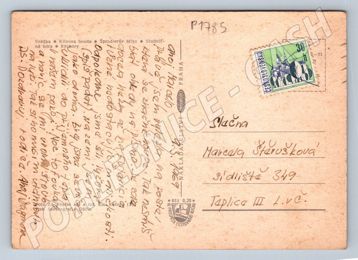 Originální pohlednice z Krkonošského národního parku, zachycující zimní scenérie a krásy tohoto malebného místa. Pohlednice je ve velmi dobrém stavu, obsahuje dobovou známku ČSR s vyobrazením motivu Košice a ručně psaný pozdrav adresovaný slečně Marcele Šťavůškové. Na přední straně jsou koláže několika snímků Krkonoš včetně dominantní Sněžky, horských chat a zasněžené krajiny. Jedná se o sběratelsky zajímavý pohled na turisticky oblíbenou oblast. Vhodné pro sběratele historických pohlednic, pamětníků či milovníků Krkonoš.