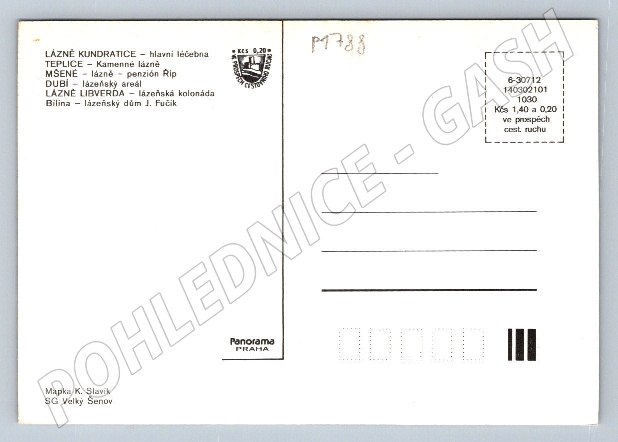 Originální pohlednice s názvem Lázně v Severočeském kraji zachycuje známá lázeňská města tohoto regionu: Lázně Kundratice, Teplice, Mšené-lázně, Dubí, Lázně Libverda a Bílina. Na přední straně je ilustrovaná mapa Severočeského kraje a několik barevných fotografií lázeňských budov, kolonád a parků, které ilustrují atmosféru těchto historických lázní. Pohlednice je nepopsaná a ve velmi dobrém sběratelském stavu. Vydala Panorama Praha, mapka K. Slavík, SG Velký Šenov. Zadní strana obsahuje stručný popis jednotlivých lázní a prostor pro adresu i známku.