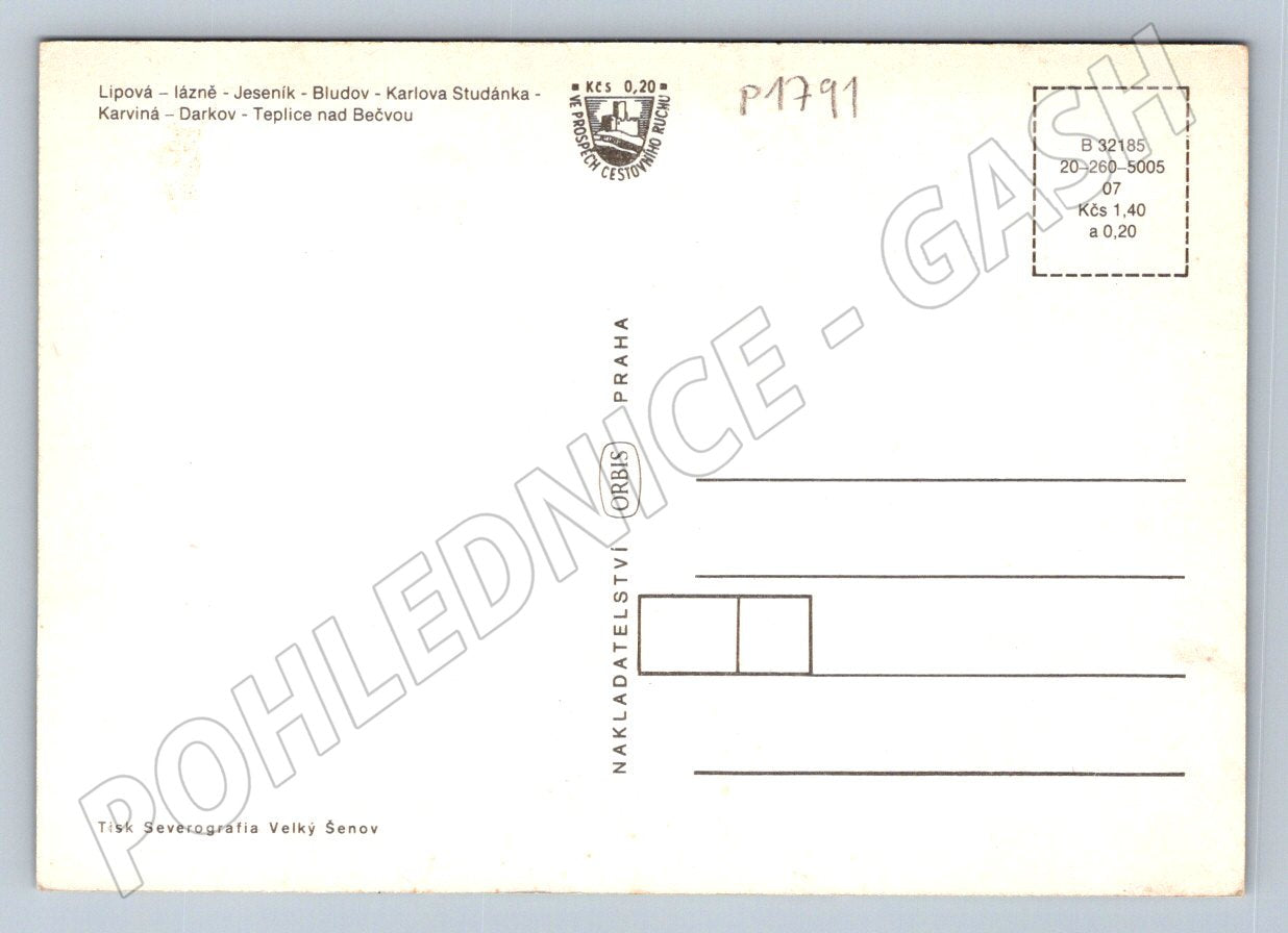 Originální pohlednice s motivem lázeňských míst v severomoravském kraji. Na přední straně je barevná mapa oblasti se zvýrazněním významných lázeňských měst (Lipová-lázně, Jeseník, Bludov, Karlova Studánka, Karviná, Darkov, Teplice nad Bečvou) a fotografie vybraných lázeňských objektů a budov. Pohlednice je nevypisaná, vydal Orbis Praha, tisk Severografia Velký Šenov. Ideální pro sběratele tématických pohlednic a milovníky regionální historie.